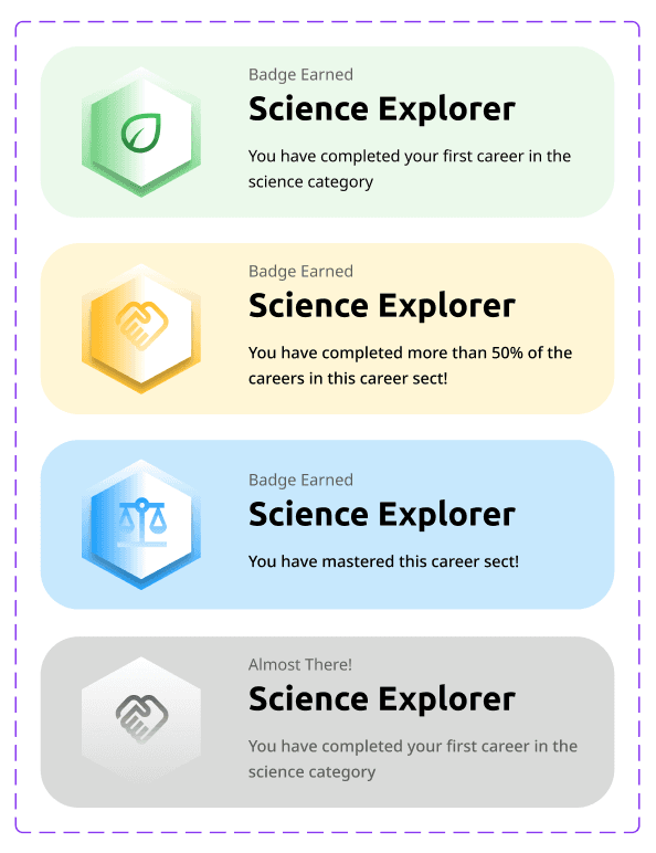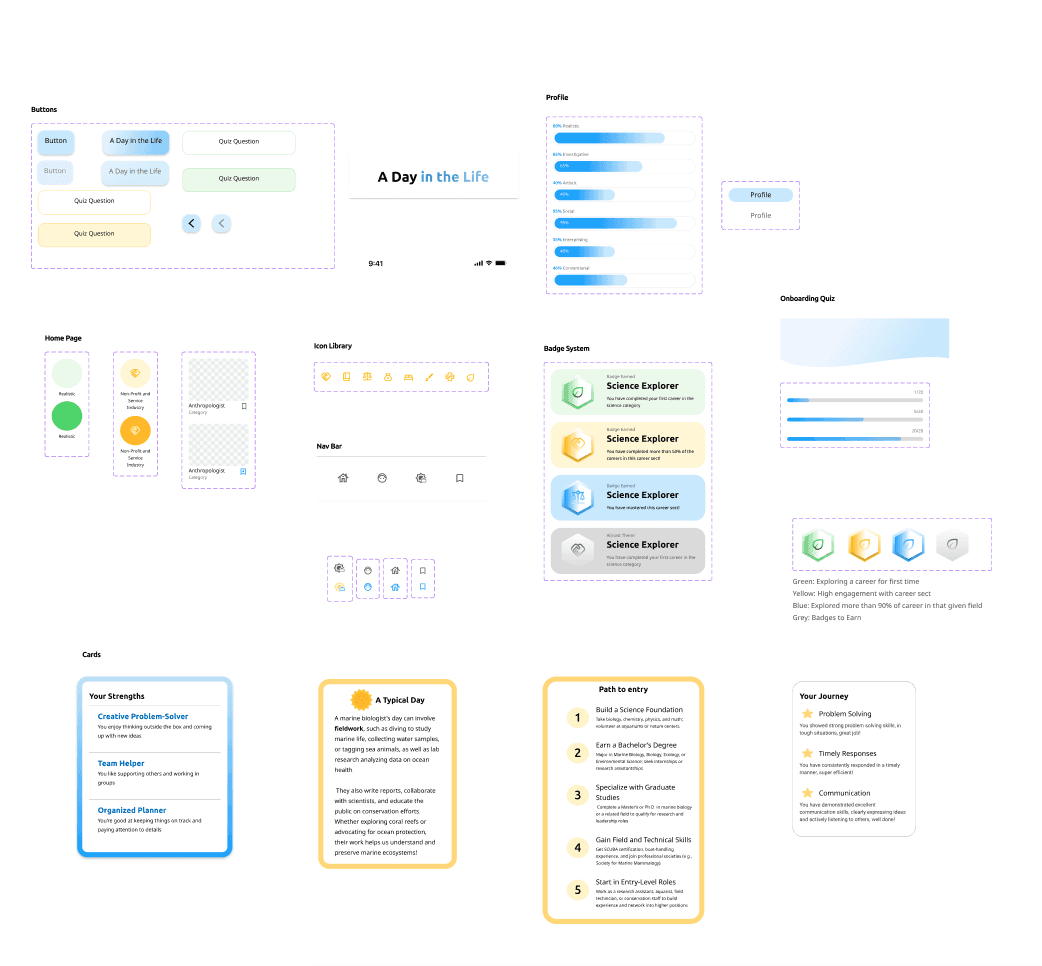 Maintaining user engagement was a key priority for this app. Drawing inspiration from learning platforms like IXL and Khan academy, which uses badges to encourage exploration, I designed a badge system that gives students a sense of accomplishment as they progress.