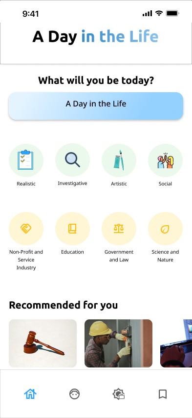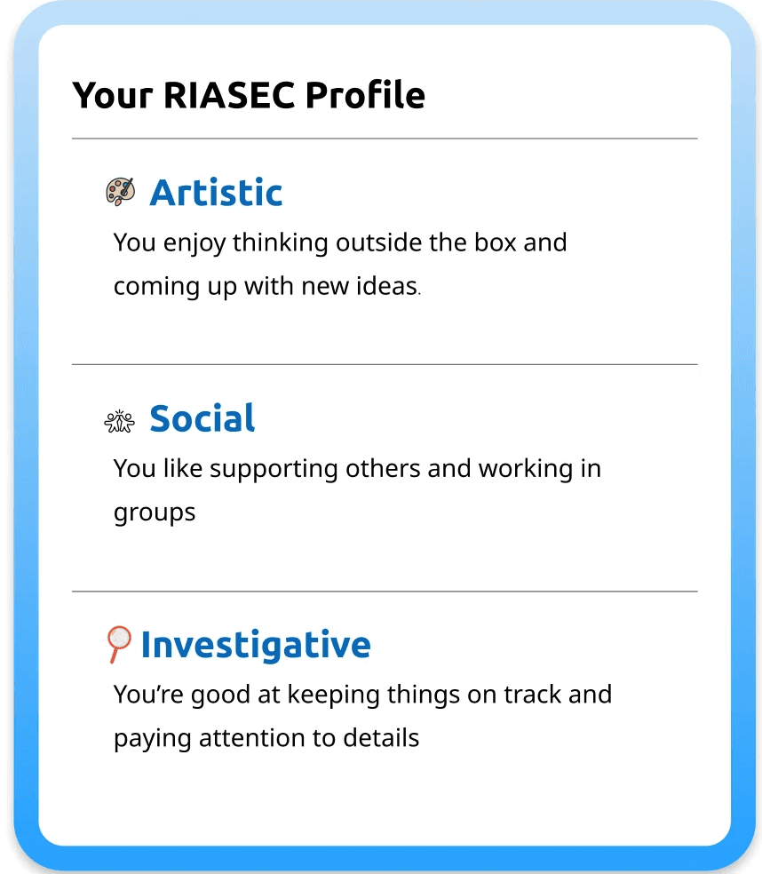 Three out of five educators I interviewed said they guide students toward careers aligned with their personal values. To reflect this insight, I incorporated the RIASEC framework throughout the app.
