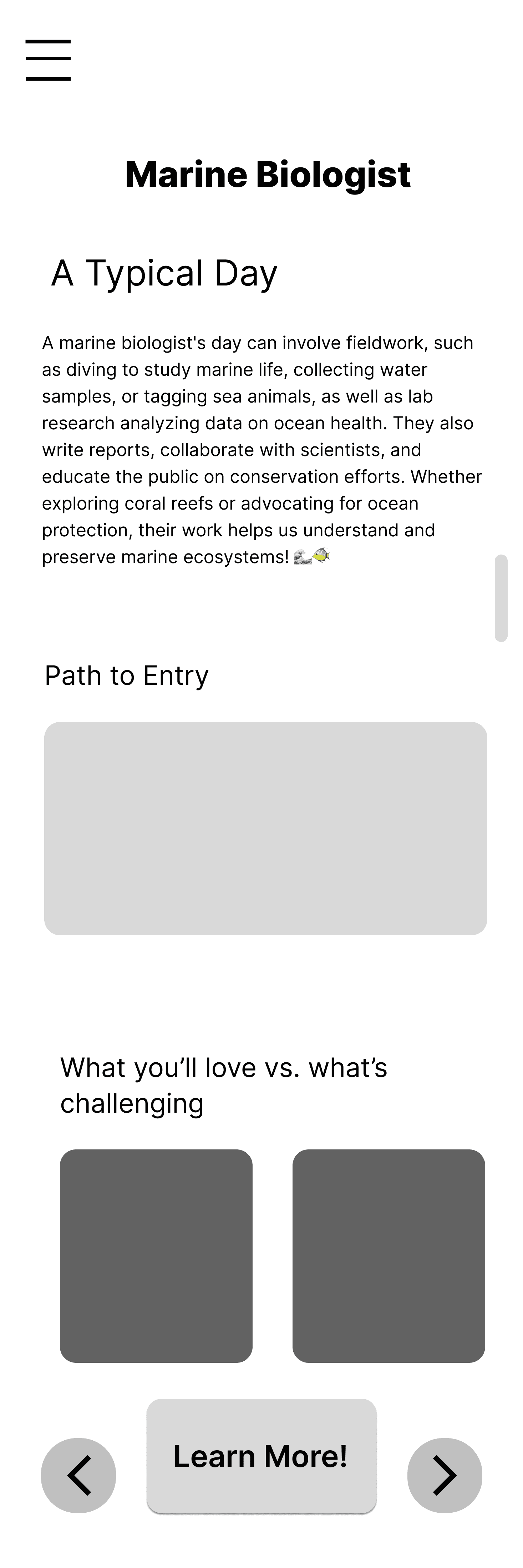 The career funnel is the core idea that my manager started with. The idea is that the user would be able to get a quick snapshot of a career, and could choose whether they would want to explore more. This feature was also meant to help maintain engagement.